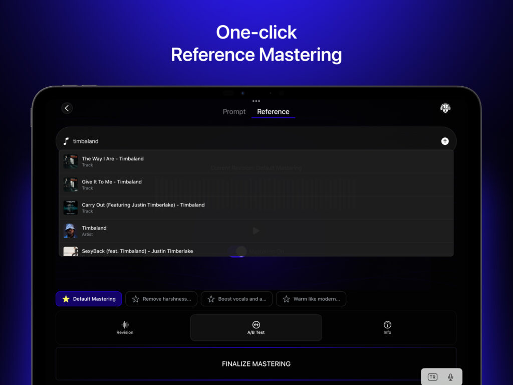 Love how your favorite songs sound? Simply select a reference track, and watch AI mastering transform your music to that standard.